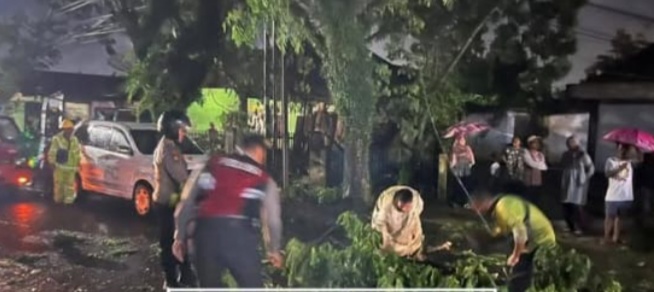 Warga yang berada di lokasi pun tak tinggal diam. Dengan semangat kekeluargaan, mereka membantu mengangkat ranting-ranting pohon ke tepian jalan agar akses jalan bisa segera terbuka kembali.