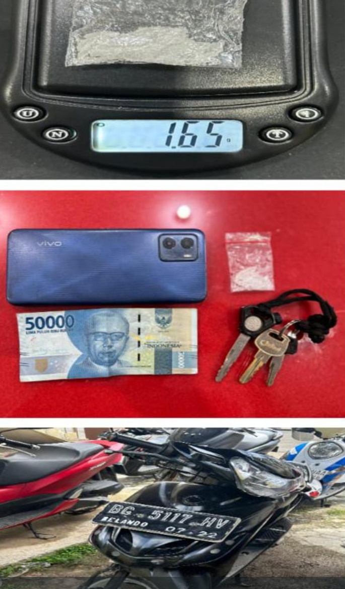 Dalam penggeledahan yang dilakukan secara teliti, petugas berhasil menemukan barang bukti berupa 1 (satu) klip plastik bening berisi kristal putih yang diduga kuat merupakan narkotika golongan I jenis Sabu dengan berat bruto 1,65 gram. Barang haram tersebut ditemukan tersembunyi di bagian stang sebelah kiri sepeda motor pelaku.